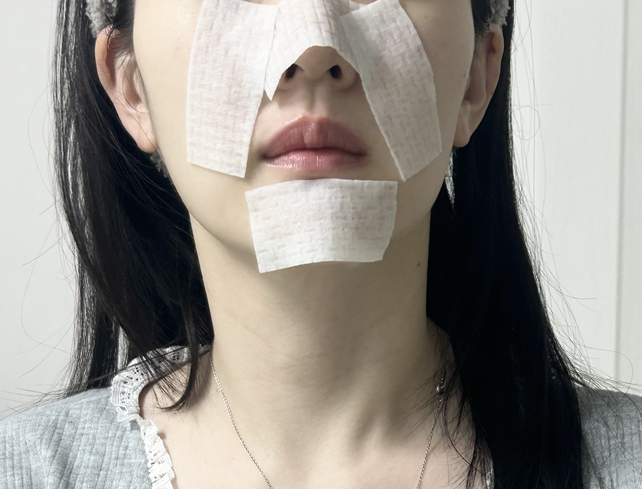 - 반 잘라 부착(강력추천🔥): 고민부위인 코, 코옆 볼, 턱에 패드를 얹어줍니다. 저는 면적이 넉넉해서 반으로 잘라 사용하는데, 이렇게 하면 고민부위에 집중적으로 밀착시킬 수 있고 훨씬 경제적이에요!